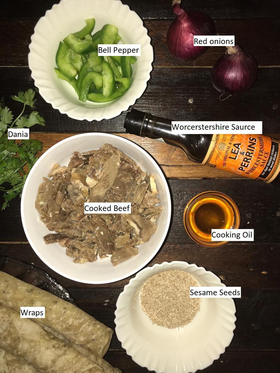 - In a sauce pan, fry the chopped onions in some cooking oil. Add the Worcestershire sauce, spices and salt as well as the boiled beef strips and bell peppers.