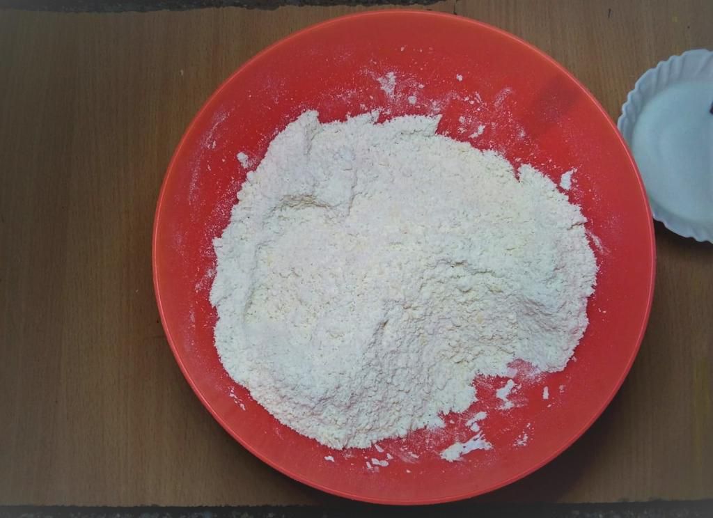 - In a large bowl mix all the dry ingredients (flour, sugar, salt, cardamom and margarine).