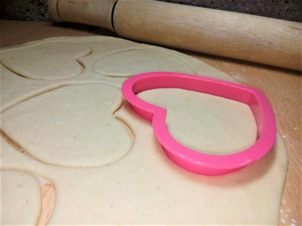 - Cut the dough into 5 pieces and roll each into a ball. Roll out each ball and using a cookie cutter cut-out the desired shapes of your mandazis. We used a heart-shaped cutter. You could also use a knife to cut out triangles.