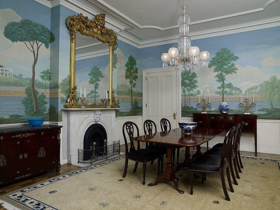 The house features multiple dining rooms, conference rooms, and sitting rooms, as well as private suites for guests, each decorated with period pieces and artworks that reflect the rich history of the residence.