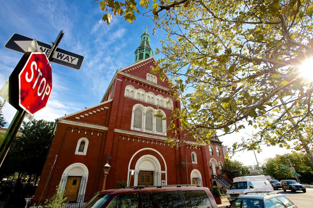 Church in Brooklyn, stop sign and one way sign