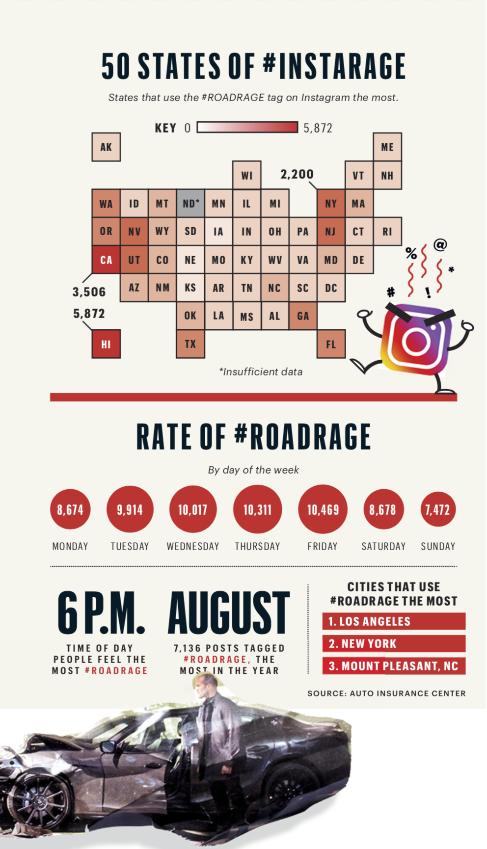 Ragers are everywhere on the road, and likely inside your own car. Research by the AAA Foundation for Traffic Safety found that nearly 80 percent of Americans admit to being aggressive when driving. The most recent National Highway and Traffic Safety Administration data suggests that between 2008 and 2017, the number of fatal crashes a year involving aggressive driving climbed from 105 to 432. According to Auto Insurance Center, the highest number-54 percent-of aggressive-driving accidents and fatalities were caused by millennials.