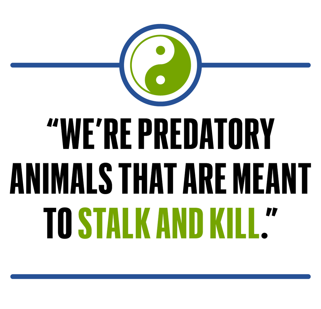 I was going to tell you that human beings are predatory animals, Jocko deadpanned. Thats why we have eyes in the front of our heads. Thats why we can attack forward. Thats why our arms go forward. Because were predatory animals that are meant to stalk and kill.