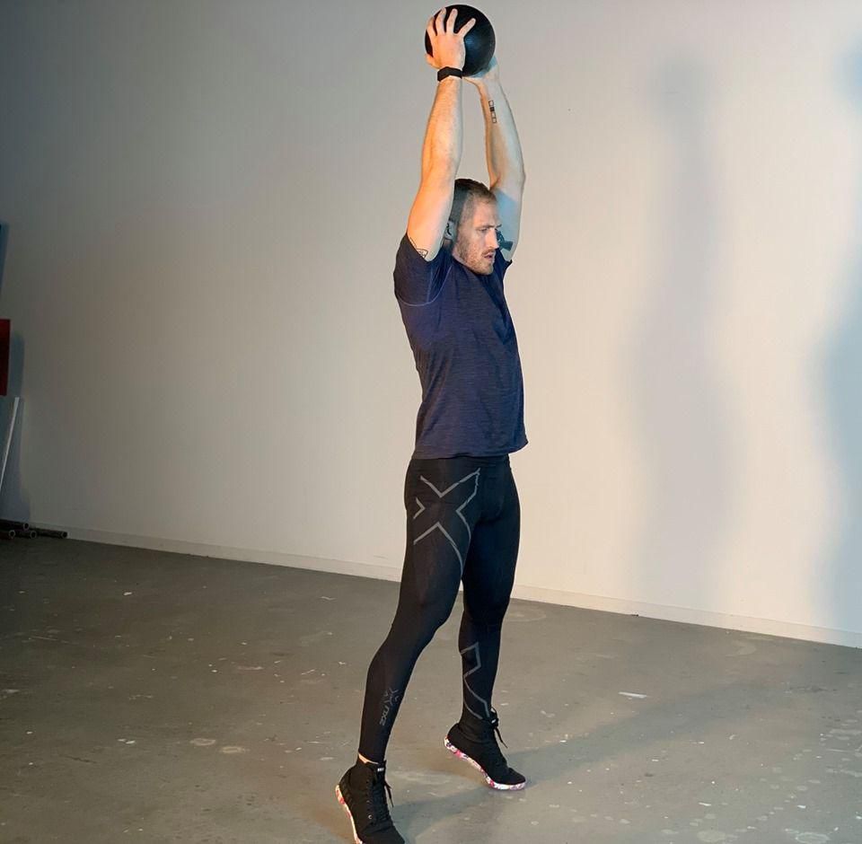 Eb says: This is part of getting tall. You want the ball at max height when you're extended, so you want to reach those arms up high. You'll often see people bring the ball behind their heads, bending at the elbows; don't fall into this trap. This costs you acceleration and slows your ability to slam: you wind up having to bring the ball upwards against gravity again, largely with only your triceps and lats driving the move, then explode downwards. Focus only on getting the ball as high as possible.