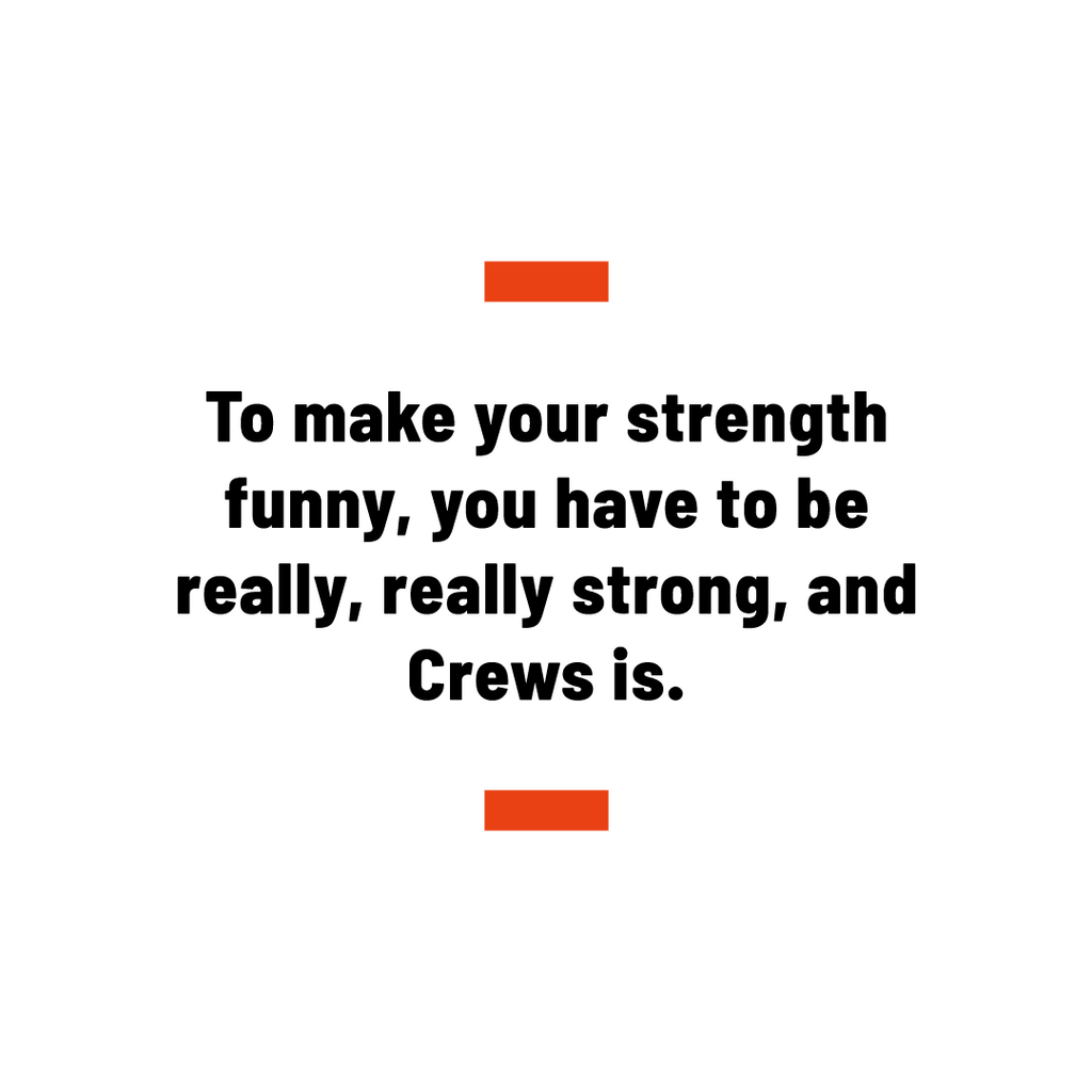 Charismatic isnt the right word. When he talks, his face resembles a series of stock photos of human emotion. Hes angry, then suspicious, and then wide-eyed at the wonders of the world (Fat Sals Deli, for example). Even when hes describing something menial, its like hes telling a ghost story. He speaks either very quietly or very loudly: I know, he says when I comment on it. I have no middle. Crews often touts his intolerance for the middle. That character is me, he says of the guy he played in his Old Spice ad campaign-always shirtless, always shouting. Im all or nothing! I live life!