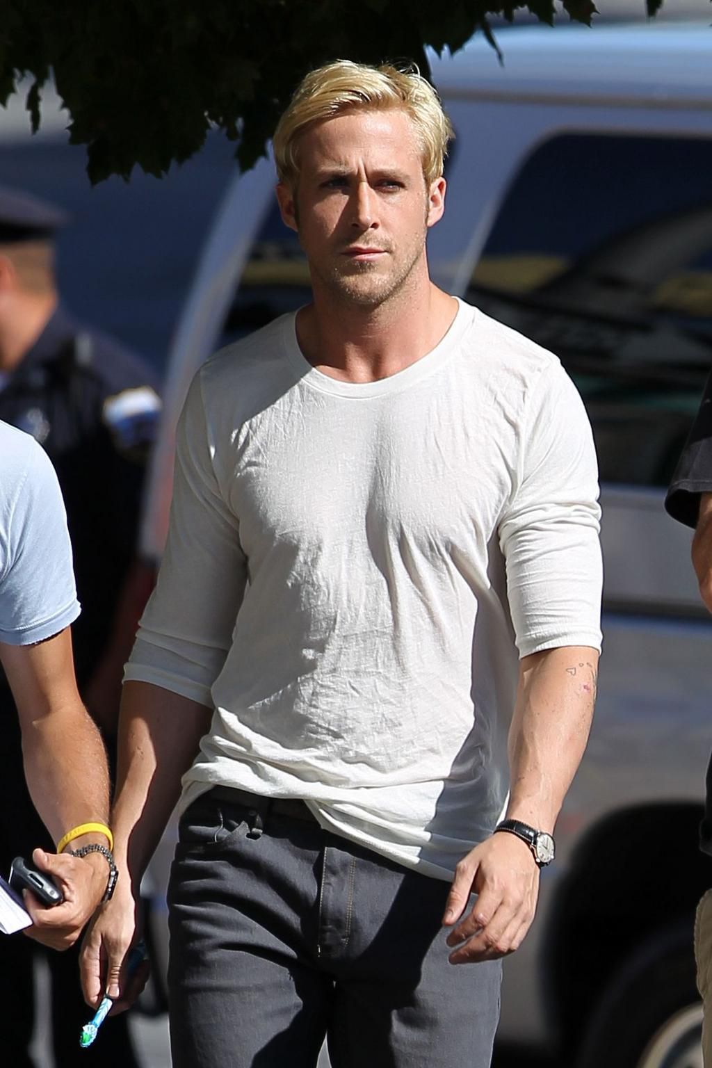 After: Ryan Gosling But while filming The Place Beyond the Pines, Gosling bleached his hair platinum blonde for the role. Christopher Peterson - Getty Images