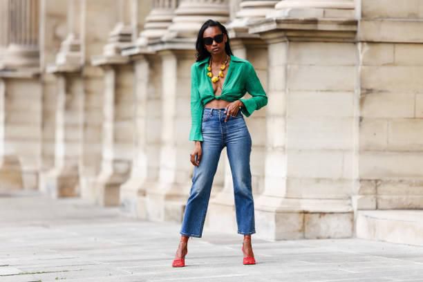 Milie Joseph wears black sunglasses, diamond earrings, a V-neck emerald green crop top with knot, a yellow shellfish necklace with multicolors stones, high-waisted mom jeans (Photo by Edward Berthelot/Getty Images)