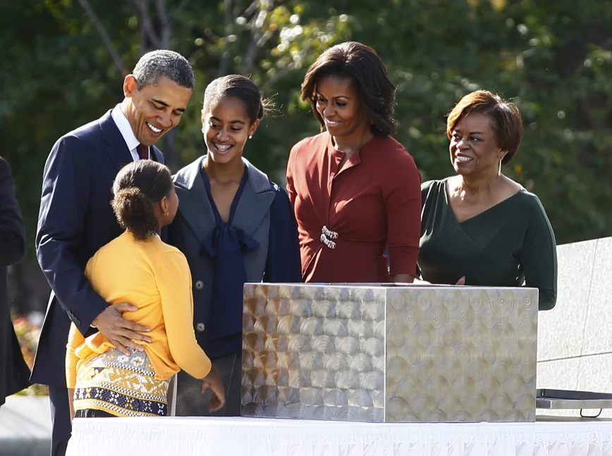 President Barack Obama (from left), his daughters Sasha and Malia, first lady Michelle Obama and Marian Robinson, Michelle Obama’s mother, at the Martin Luther King Jr. National Memorial on the National Mall in Washington in 2011.Carolyn Kaster/AP