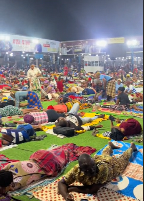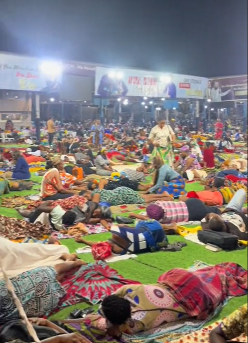 In the video, a vast crowd of attendees can be seen mingling, praying, and participating in various activities.