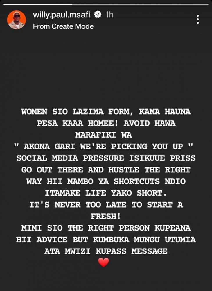 "Women sio lazima form, kama hauna pesa kaaa home! Avoid hawa marafiki wa akona gari we’re picking you up. Social media pressure isikuue please. (Women, partying is not must, please stay home if you do not have the money. Avoid “he has a car we’re picking you up” types of friends. Do not let social media pressure kill you)” Willly Paul added.