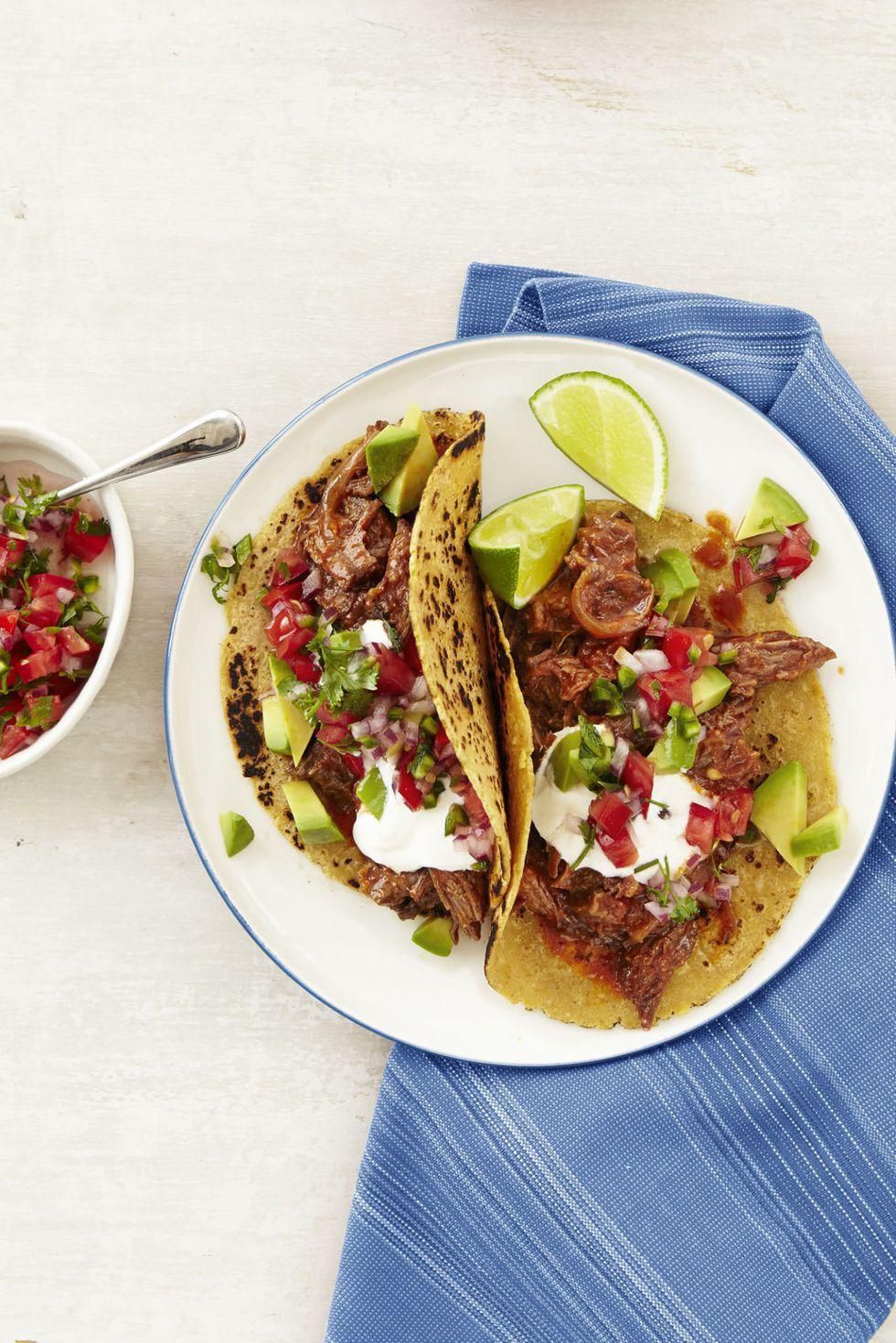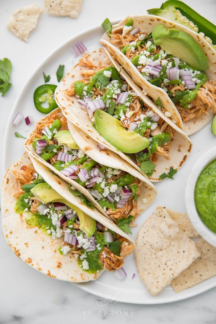 Crock-Pot Chicken Tacos with Avocado-Cilantro Sauce Tender chicken is the perfect base for these tacos' tangy, creamy cilantro sauce. GET THE RECIPE Per serving: 382 calories, 13 g fat (2 g sat), 40 g carbs, 1075 mg sodium, 6 g fiber, 5 g sugar, 24 g protein 40 Aprons