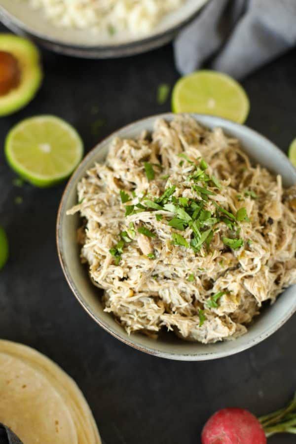 Slow-Cooker Chicken Chile Verde This five-ingredient chicken is perfect with salsa and lettuce cups. GET THE RECIPE Per serving: 195 calories, 7 g fat, 5 g carbs, 1 g sugar, 495 mg sodium, 3 g fiber, 27 g protein The Real Food Dietitians