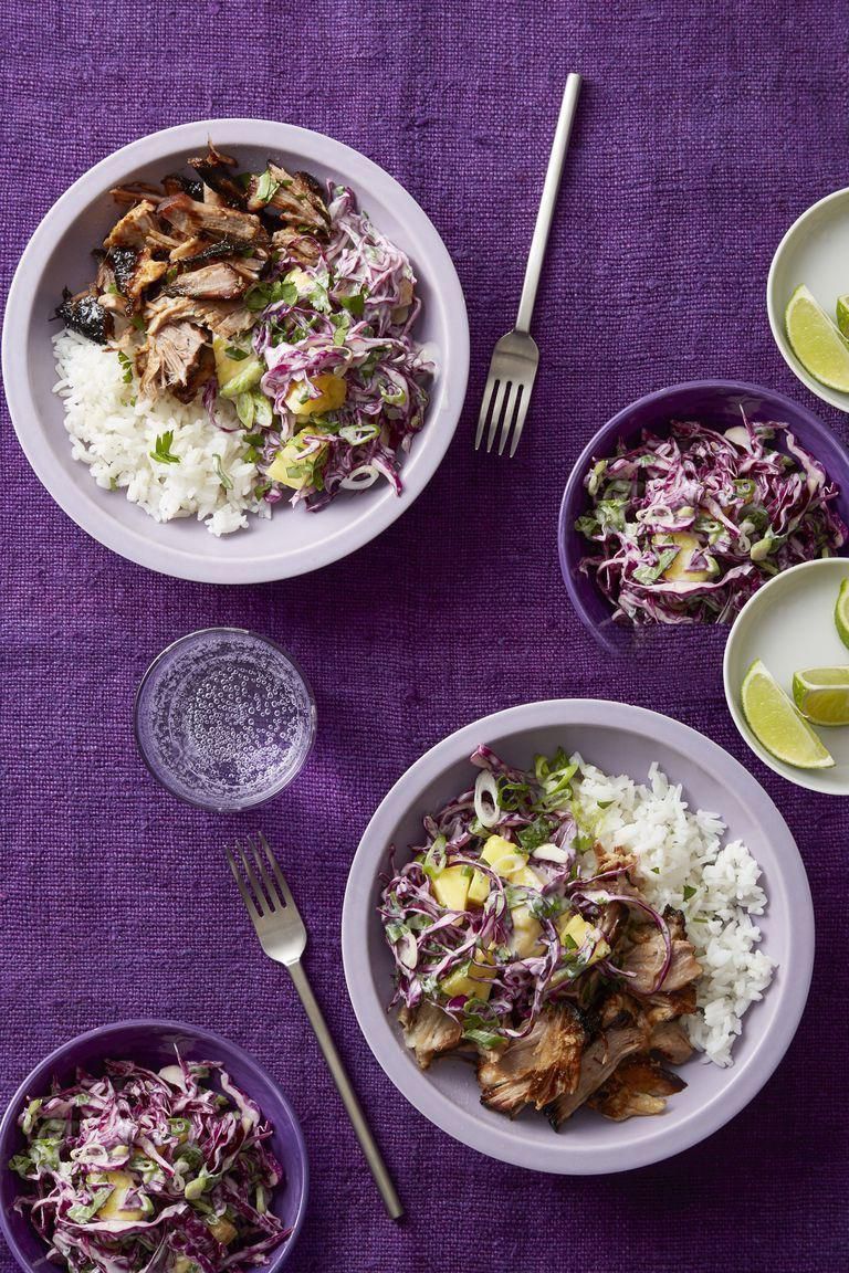Honey-Lime Pork with Pineapple Slaw Slow-cooked pork is perfect with bright lime juice and chunks of fresh pineapple in these festive burrito bowls. GET THE RECIPE Per serving: 375 calories, 10.5 g fat (3.5 g saturated), 36 g carbs, 895 mg sodium, 2 g fiber, 35 g protein Woman's Day