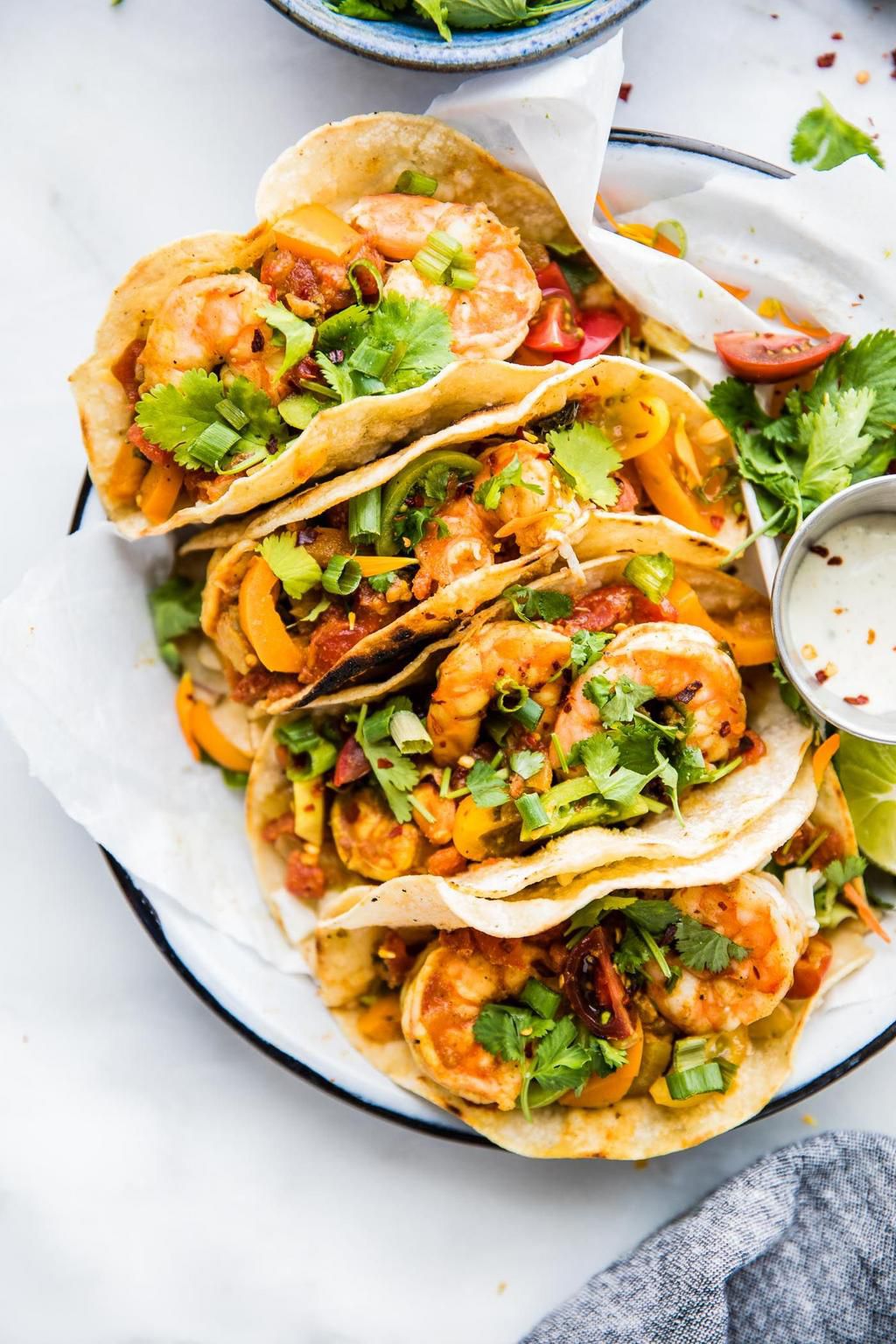 Easy Crock-Pot Fire Roasted Tomato Shrimp Tacos Easy, breezy, and beautifully light (see what I did there?), this healthy take on tacos is a fiesta in your mouth. GET THE RECIPE Per serving: 115 calories, 2.5 g fat (0.5 g saturated), 5 g carbs, 2.5 g sugar, 240 mg sodium, 1.5 g fiber, 14 g protein Cotter Crunch