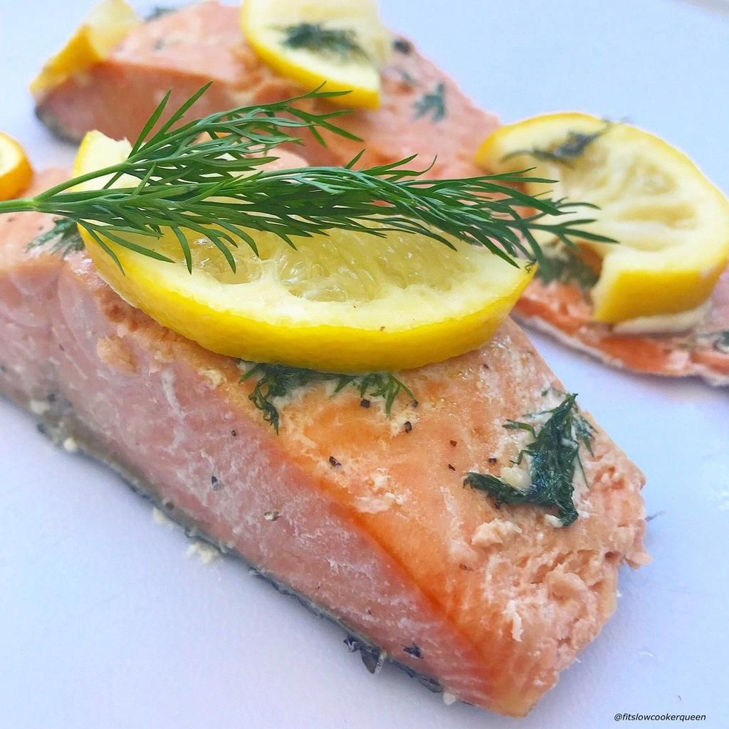Slow-Cooker Salmon with Lemon and Dill Low-carb, paleo, and Whole30-compliant, this tasty dish is a superb source of brain-boosting omega-3s . GET THE RECIPE Per serving: 321 calories, 12.7 g fat (2.1 g saturated), 1.8 g carbs, 0.4 g sugar, 177.8 mg sodium, 0.4 g fiber, 50.8 g protein Fit Slow Cooker Queen