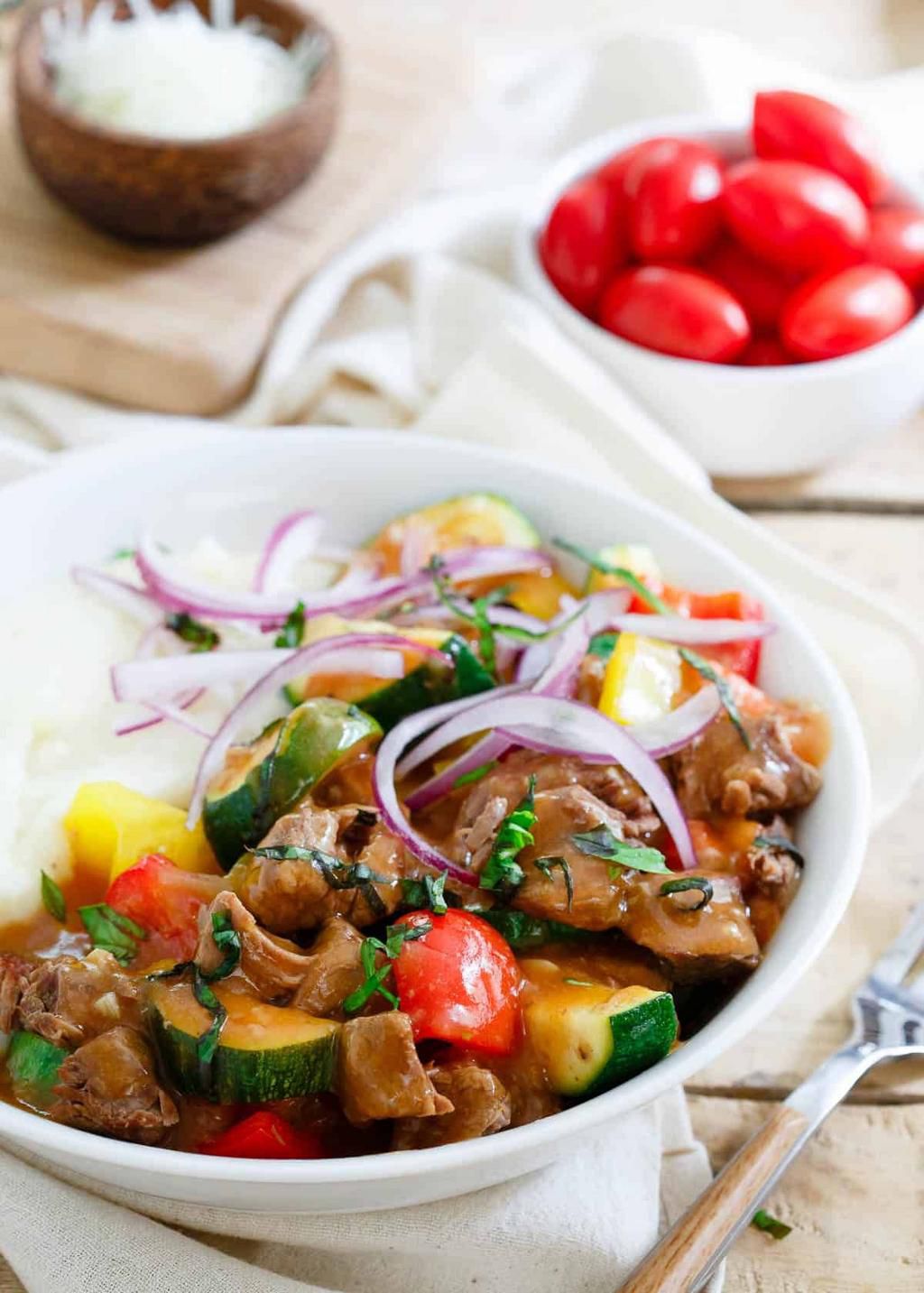 Slow-Cooker Summer Beef Stew Stews typically have serious winter vibes, but the zucchini, bell pepper, basil, and other vibrant veggies in this one keep it light and summer-friendly. GET THE RECIPE Per serving: 487 calories, 18 g fat (6 g sat), 14 g carbs, 687 mg sodium, 3 g fiber, 6 g sugar, 69 g protein Running to the Kitchen