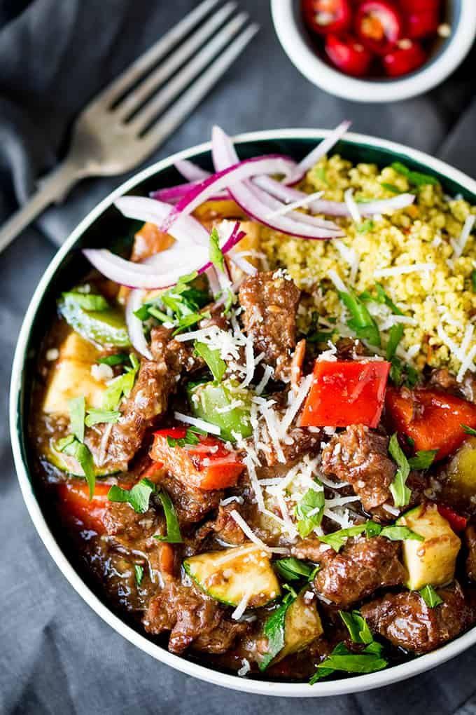 Slow-Cooked Summer Beef Casserole Crisp veggies, garlic, and a light sprinkling of Parm make this once-winter dish a comfy go-to even during high temps. GET THE RECIPE Per serving: 305 calories, 13 g fat (3 g saturated), 11 g carbs, 2 g sugar, 487 mg sodium, 1 g fiber, 30 g protein Kitchen Sanctuary