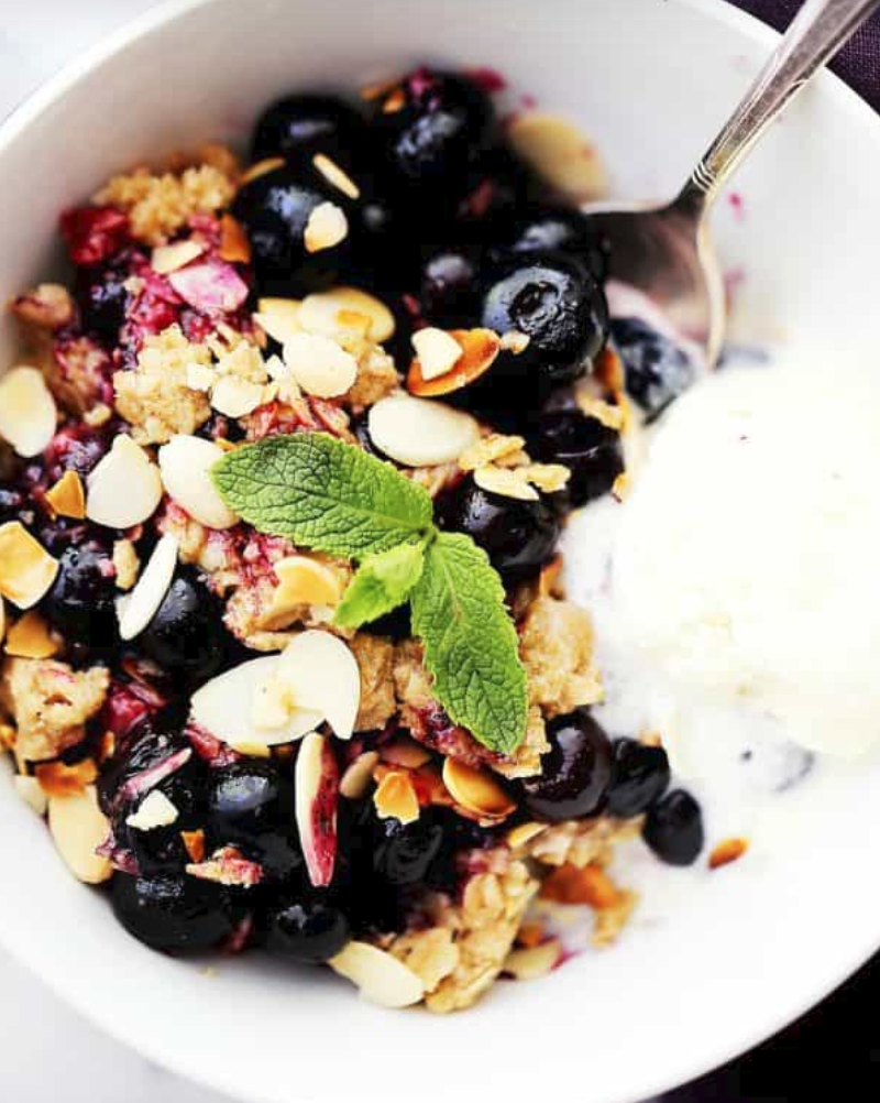 Crock-Pot Blueberry Crisp Top this easy-to-make blueberry crisp with a scoop of vanilla ice cream and you've got yourself the perfect end to a summer night. GET THE RECIPE Per serving: 215.3 calories, 6.6 g fat (3.6 g sat), 38 g carbs, 5.1 mg sodium, 4 g carbs, 22.8 g sugar, 2.8 g protein Diethood