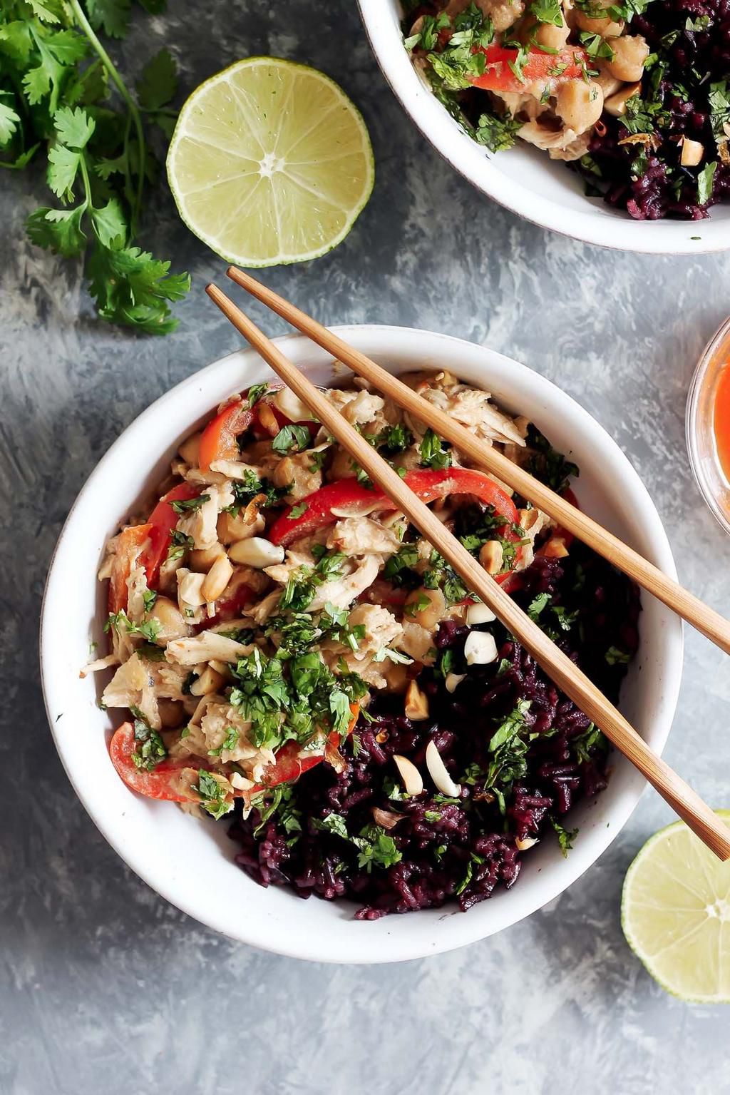 Slow-Cooker Thai Peanut Chicken with Spicy Coconut Purple Rice Peanut butter is delish but have you ever mixed it with almond or coconut milk and heated it up? *Stomach growls.* Add veggies, chicken, and rice, and you've got a well-balanced nutty nosh. GET THE RECIPE Per serving: 450 calories, 17 g fat (5 g saturated), 44.6 g carbs, 5 g sugar, 4.7 g fiber, 33.4 g protein Ambitious Kitchen