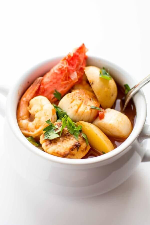 Crock-Pot Seafood Stew Nothing feels beachier than this seafood stew, which is filled to the brim with shrimp, scallops, and crab legs, and loaded with brain-boosting benefits. GET THE RECIPE Per serving: 236 calories, 1 g fat, 31 g carbs, 8 g sugar, 1789 mg sodium, 4 g fiber, 22 g protein Slow Cooker Gourmet