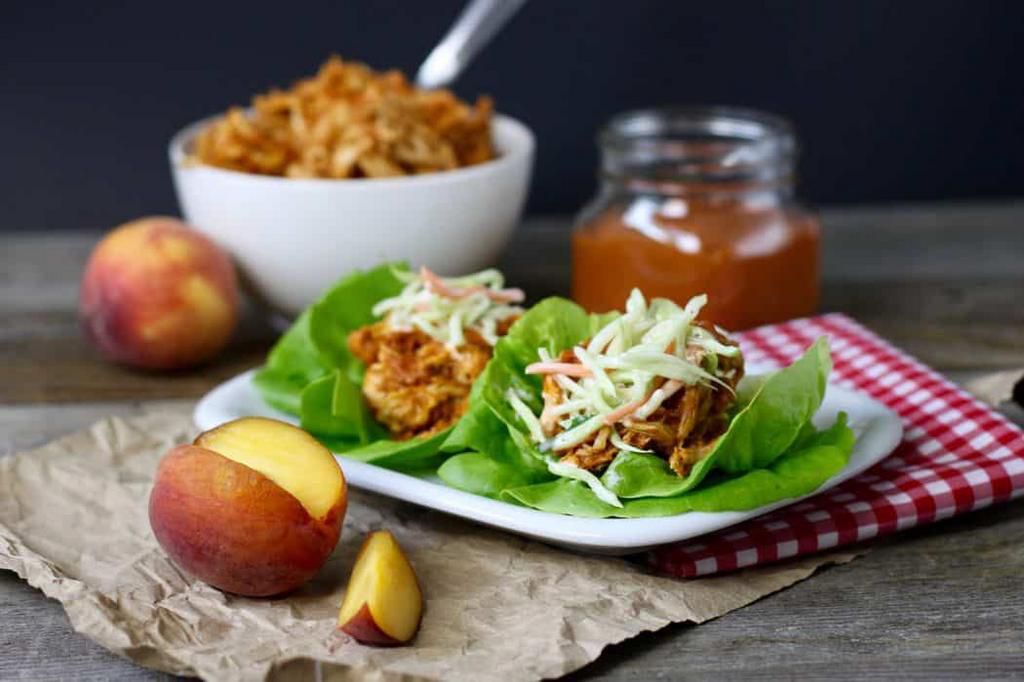 Slow-Cooker Peach BBQ Chicken This Whole-30-approved BBQ dish tastes like sweet summertime. After making the fruity sauce, all you have to do is add everything to the Crock-Pot and let it do the rest. GET THE RECIPE Per serving: 225 calories, 15 g fat, 10 g carbs, 3 g sugar, 389 mg sodium, 2 g fiber, 30 g protein The Real Food Dietitians