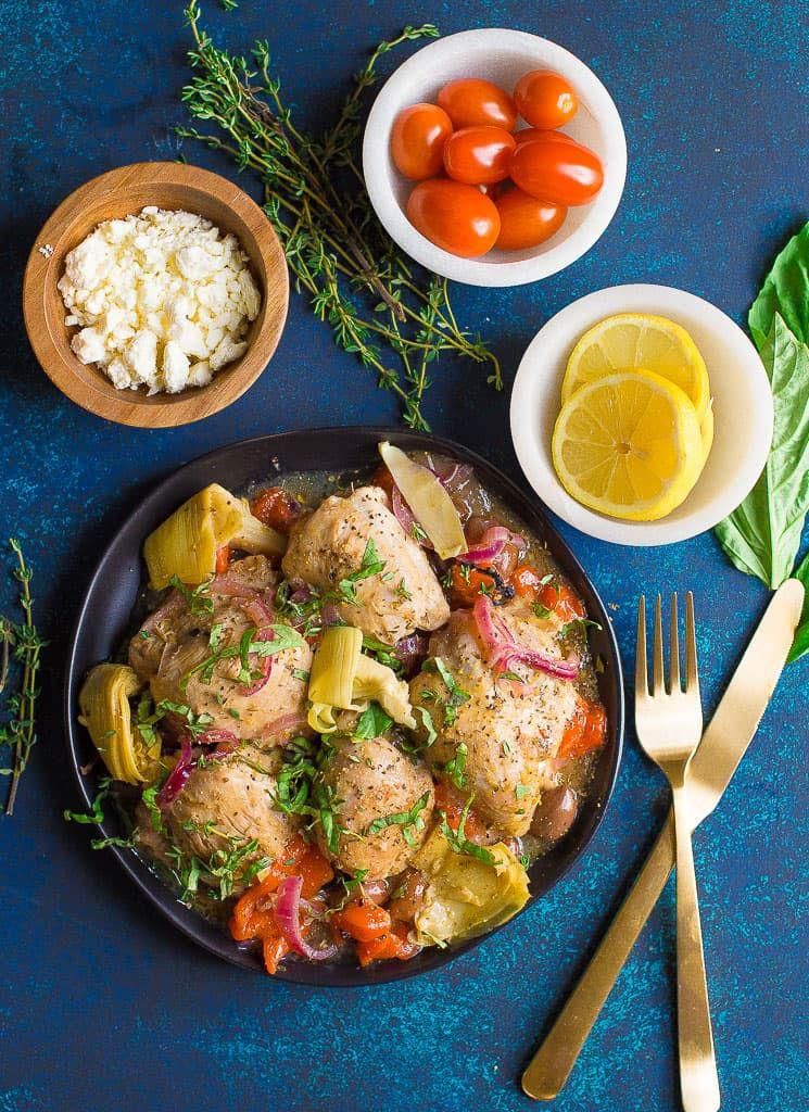 Slow-Cooker Greek Chicken This herby, citrusy chicken pairs so well with a dollop of tart yogurt and a pita that you'll think you're in the Mediterranean. GET THE RECIPE Per serving: 452 calorie, 36 g fat (9 g sat), 4 g carbs, 899 mg sodium, 1 g fiber, 26 g protein Wholesomelicious