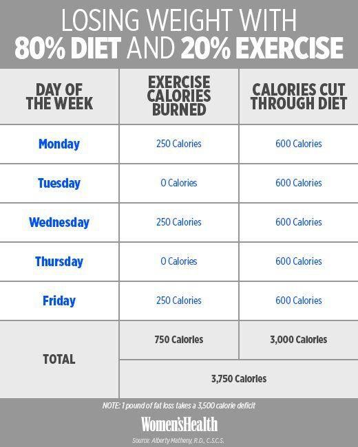 Why Your Meals Are So Important The key to weight loss is achieving a negative energy balance, or taking in less calories than you burn, says Albert Matheny , R.D., C.S.C.S., co-founder of SoHo Strength Lab and PROMIX Nutrition . To shed a single pound, you need to achieve a 3,500 calorie deficit. So if you're following the 80/20 ratio, you'd want to burn approximately 750 calories through exercise and cut an additional 3,000 calories through dieting, says Matheny. Thats a total deficit of 3,750 calories for the week.