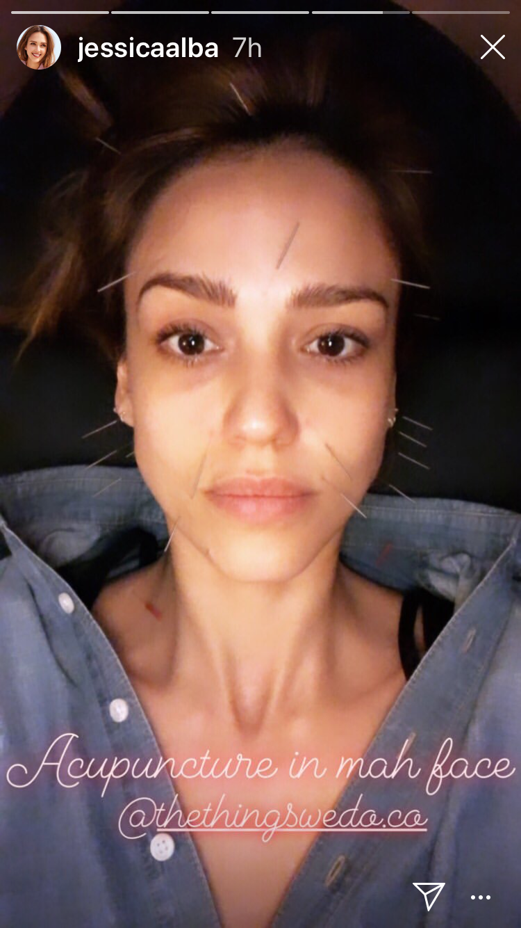 Actress and The Honest Company co-founder, Jessica Alba, just shared a glimpse into how she keeps her skin so incredible with her latest no-makeup Instagram selfie. Over the weekend, she hit up The Things We Do spa in Los Angeles and tried a super trendy treatment: an acupuncture facial, posting a pic of her makeup-free face covered in tiny needles.
