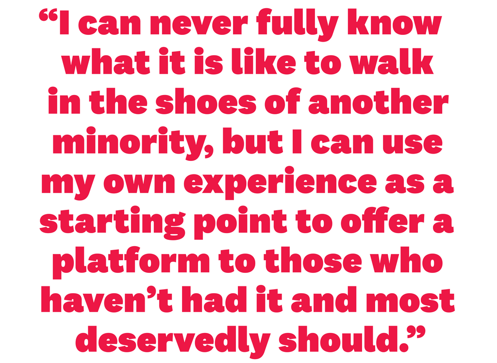 i can never fully know what it is like to walk in the shoes of another minority, but i can use my own experience as a starting point to offer a platform to those who havent had it and most deservedly should
