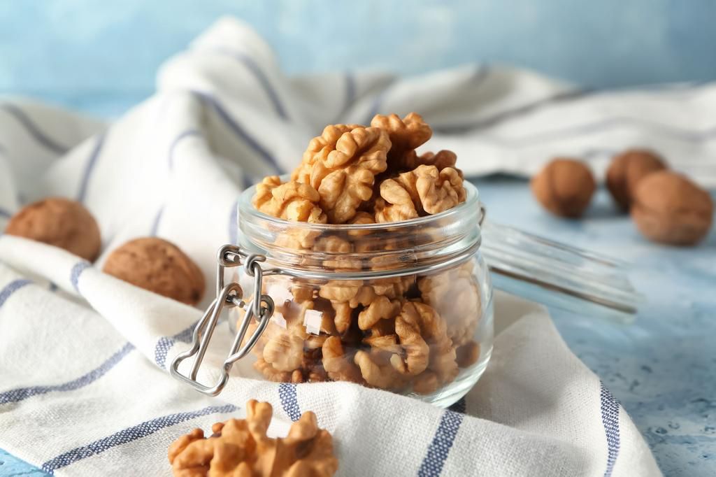Glass jar with shelled walnuts on table