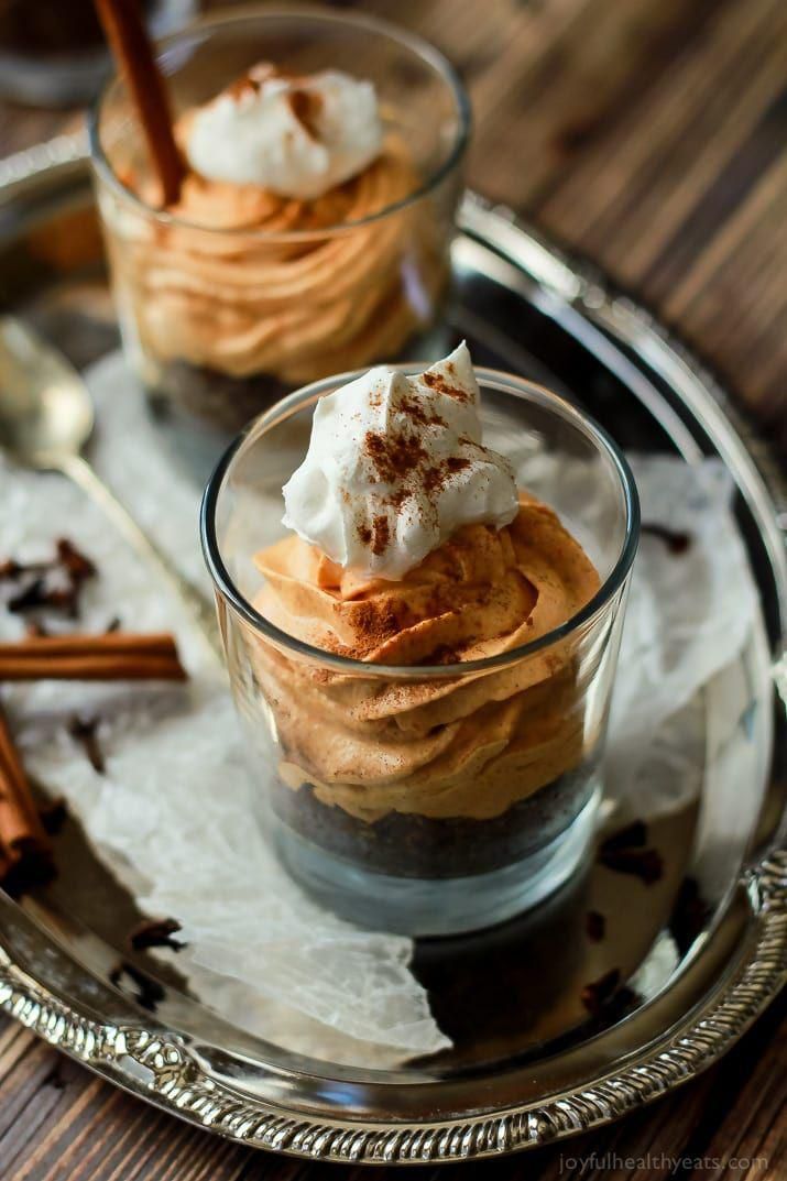 Pumpkin Mousse Shooters Okay, how cute are these little pumpkin mousse shooters? Vegan, dairy-free, and gluten-free, they taste like light and airy pumpkin pie filling. Get the Recipe Per serving: 247 calories, 16.4 g fat, 24.8 g carbs, 15.2 g sugar, 4 g fiber, 4.7 g protein Courtesy