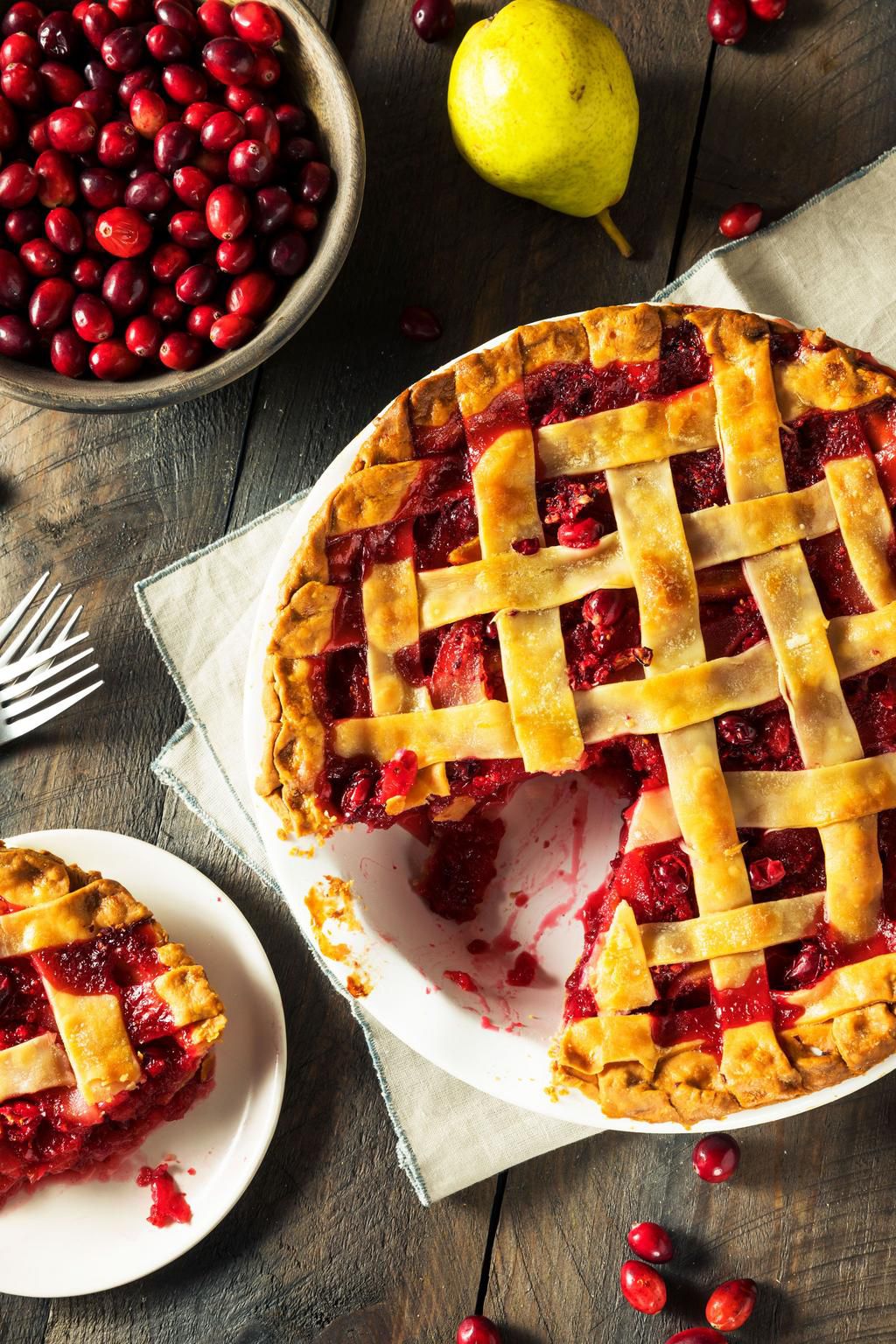 Cranberry-Pear Lattice Pie The tart burst of cranberries and sweet pears in this jewel-colored creation will make your taste buds smile. Plus, the lattice crust makes it a fancy-looking addition to your holiday table. Get the Recipe Per one-slice serving: 330 calories, 16 g fat (10 g sat), 46 g carbs, 165 mg sodium, 4 g fiber, 3 g protein bhofack2