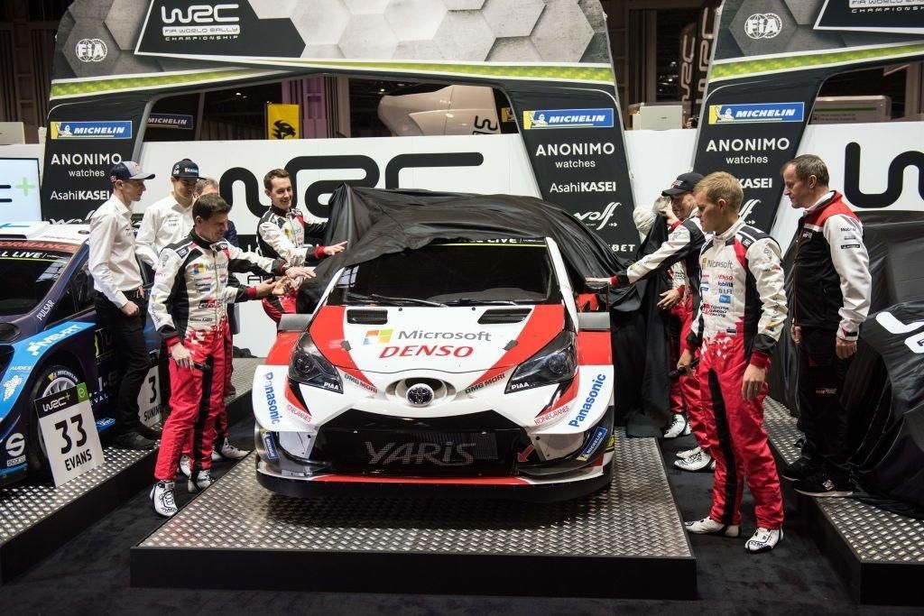 Toyota drivers, co-drivers and team principal unveil their Toyota Yaris WRC car at the launch of the 2019 FIA World Rally Championship (WRC) at the Autosport International show held in the NEC convention centre in Birmingham, central England on January 12, 2019. - Ford M-Sport World Rally Team, Hyundai Shell Mobis World Rally Team, Toyota Gazoo Racing World Rally Team and Citroen Total Abu Dhabi World Rally Team all unveiled their 2019 rally cars, drivers and co-drivers prior to the season-opener at the Rallye Monte-Carlo on January 24, 2019. (Photo by OLI SCARFF / AFP) (Photo credit should read OLI SCARFF/AFP via Getty Images)