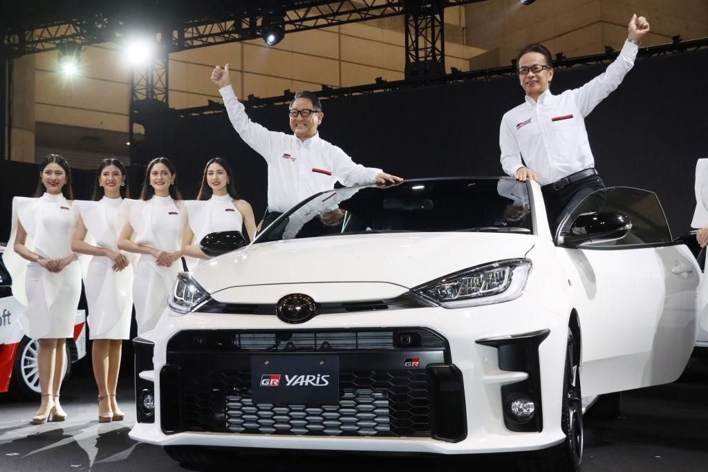 Toyota Motor President Akio Toyoda (L) and Executive Vice President Shigeki Tomoyama (D) unveil the GR Yaris rally car at the 2020 Tokyo Auto Salon in Chiba, a suburb of Tokyo on January 10, 2020, Japan. (Photo by YOSHIKAZU TSUNO/Gamma-Rapho via Getty Images)