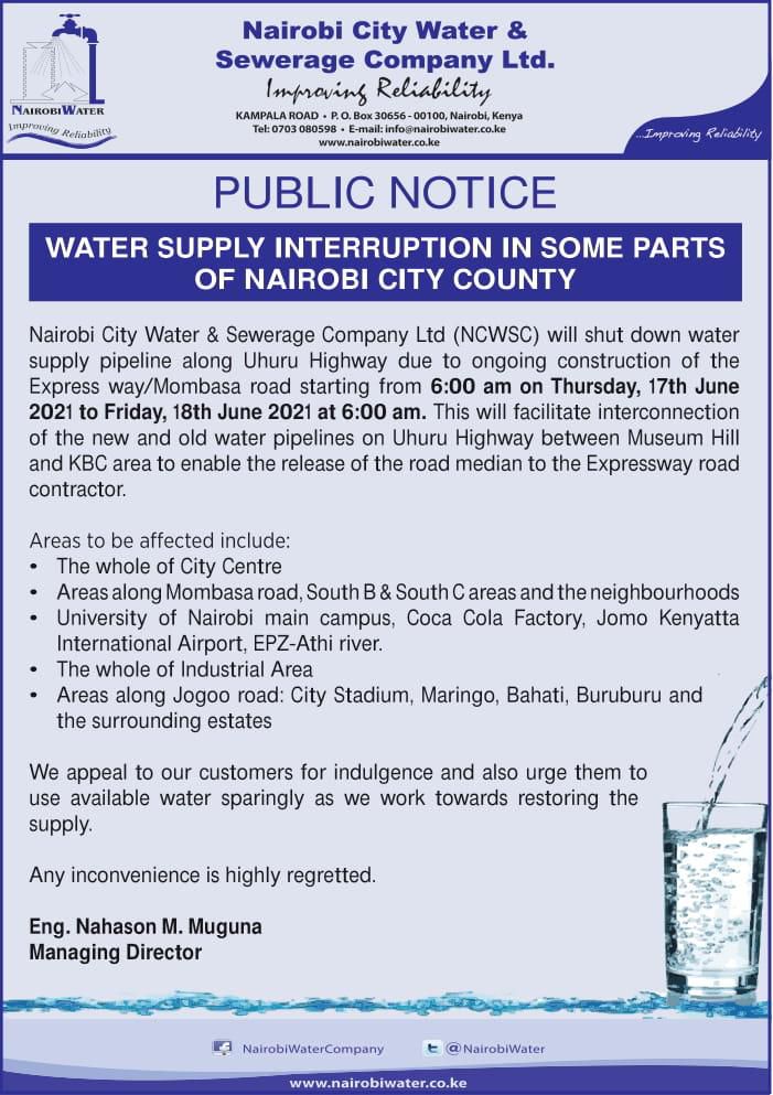 "NCWSC will shut down water supply pipeline along Uhuru Highway due to ongoing construction of the Expressway/ Mombasa road starting from 6:00 am on Thursday 17th June, 2021 to Friday 18th June, 2021 at 6:00am.
