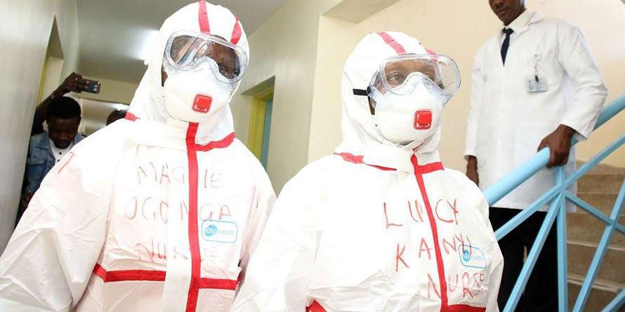 File image of medics wearing protective gear at Mbagathi Hospital in Nairobi where an isolation and treatment centre for the new coronavirus was set up on March 6