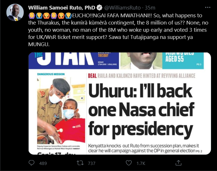 "EUCHO! NGAI FAFA MWATHANI! So, what happens to the Thurakus, the kumìrà kùmèrà contingent, the 8 million of us? None, no youth, no woman, no man of the 8M who woke up early and voted 3 times for UK/WsR ticket merit support?" the tweet read in part.