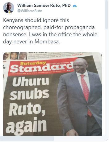 This comes after a Standard did a story on the DP with the title 'Uhuru snubs Ruto again'. The DP went ahead to state that he was in the office the whole day and not in Mombasa.