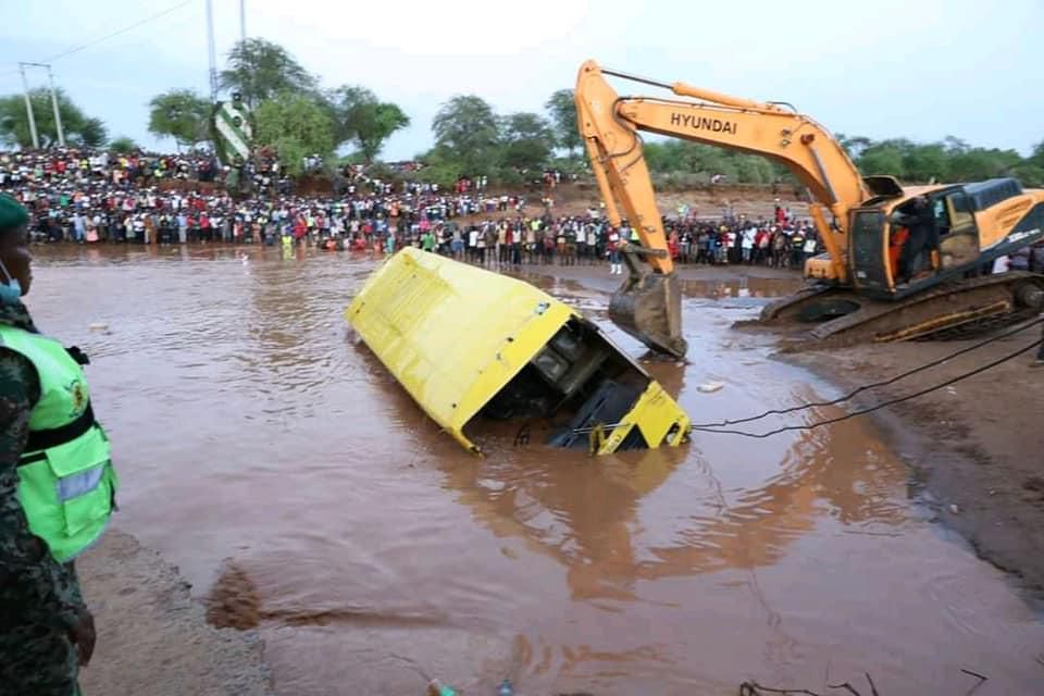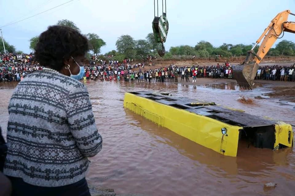 The bus was taking the church choir and other revellers to a wedding in Kitui on Saturday when it keeled over and sank beneath fast-flowing waters as the driver tried to navigate a submerged bridge.