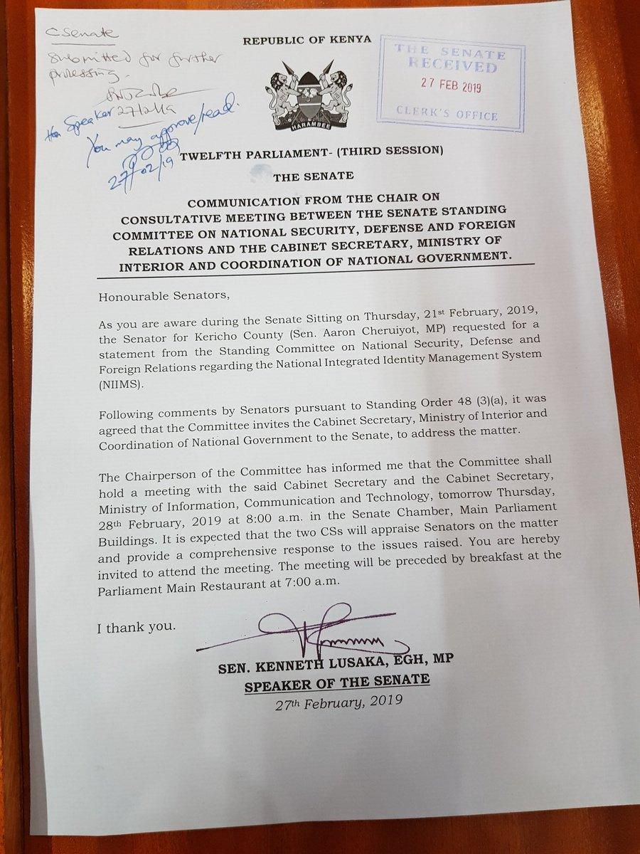 In addition, the two were summoned after Kericho Senator Aaron Cheruiyot raised concerns over the justification of the processes in regards to the amount of personal information that will be collected from Kenyans.