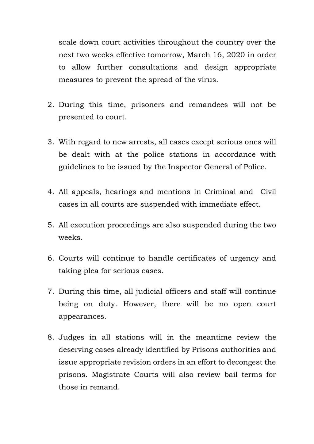 The courts will however continue to handle certificates of emergency and taking plea in serious cases.