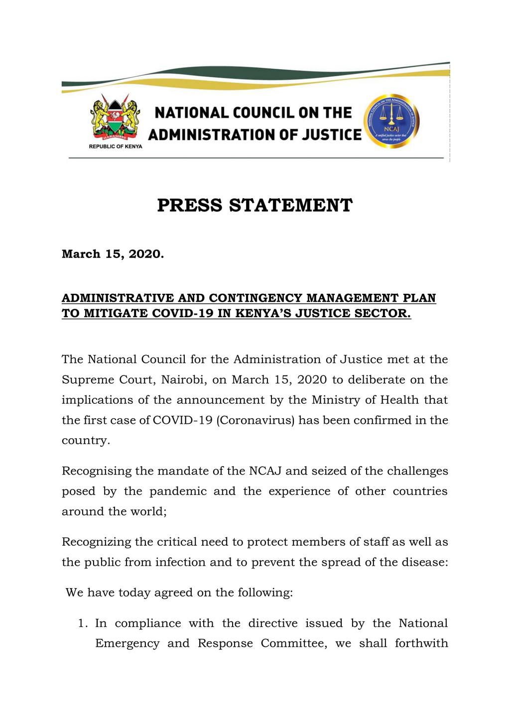Below is the full statement on the Judiciary's response to the Covid-19 virus in Kenya.
