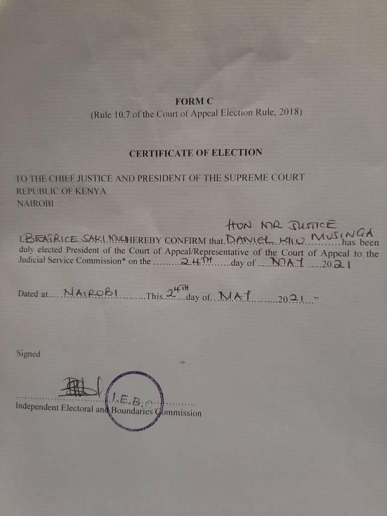 Musinga will now represent the court at the Judicial Service Commission. The elections were held in Nairobi on May 24 2021.