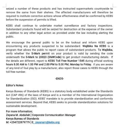 KEBS stated that they had seized a number of those products but instructed supermarkets to also remove them from their shelves.