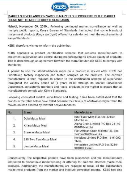 In a statement issued on Saturday, 09 November 2019, KEBS suspended Dola maize meal, Kifaru Maize Meal, Starehe Maize meal, Jembe Maize Meal and 210 Two Ten maize meal from selling, due to their high levels of aflatoxin.