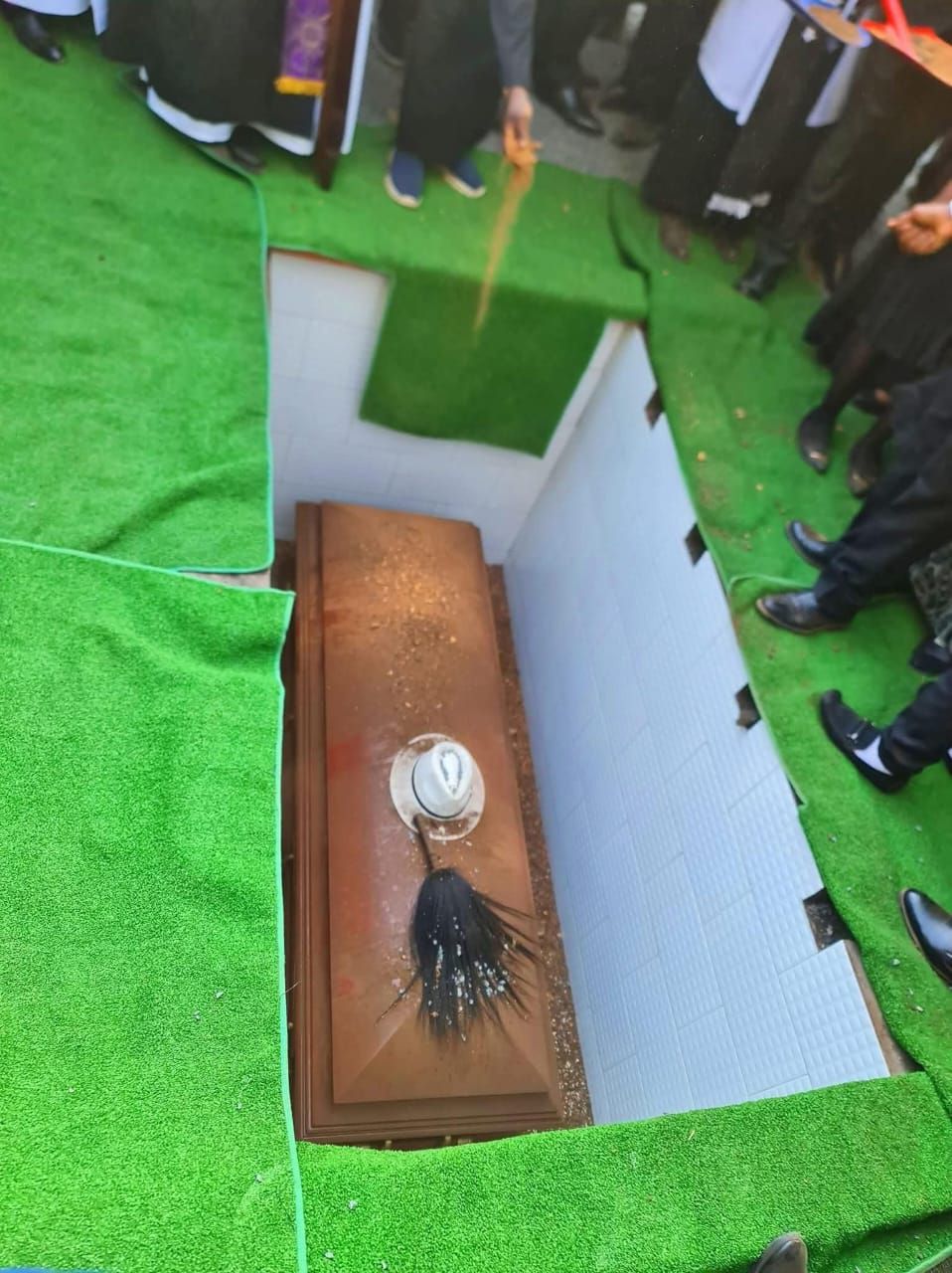 The flywhisk and the hat resting on Raila's coffin in his grave