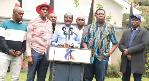 Kalonzo Musyoka and other Principal Secretaries of Azimio Coalition during a press briefing held at the Kenya School of Government on July 19, 2024.