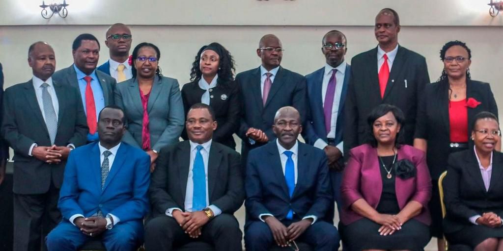 Attorney General Justin Muturi (seated second left) and Justice Erik Ogolla (centre) joined by members of the commission of inquiry into the Shakahola cult deaths at Milimani Law Court on May 9, 2023.