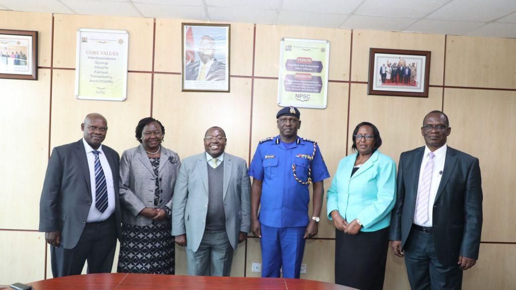 NPSC Chairperson, Eliud Kinuthia, CBS, (3rd left) flanked by NPSC Commissioners and Ag. CEO/CS welcoming Douglas Kanja in blue Police Uniform at NPSC Headquarters.