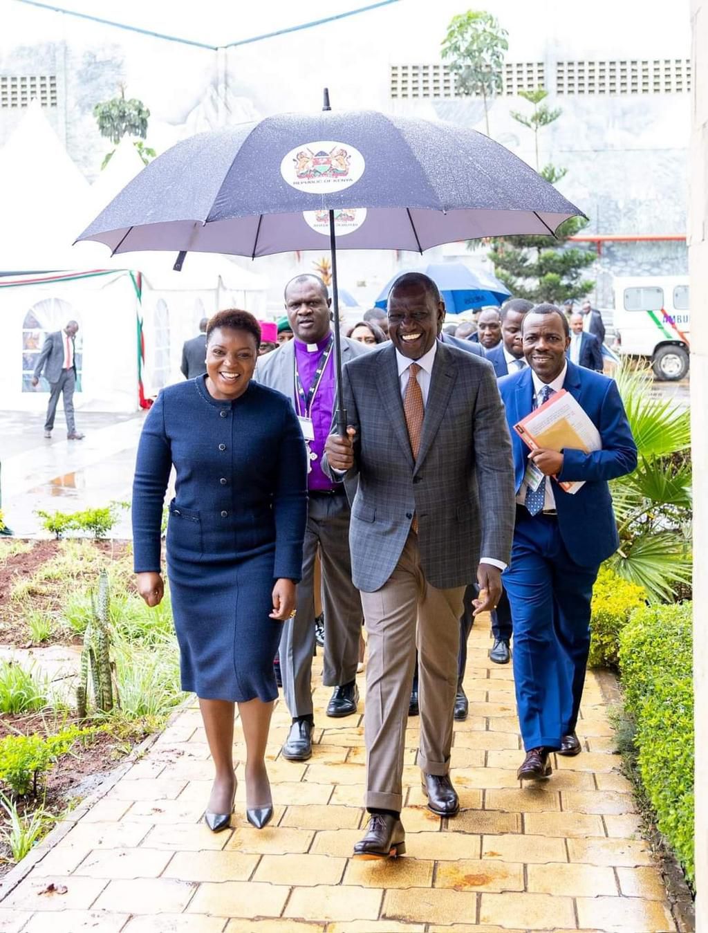 President William Ruto holds an umbrella to shield Health CS Susan Nakhumicha from rains in Syokimau, Machakos County on November 22, 2023.